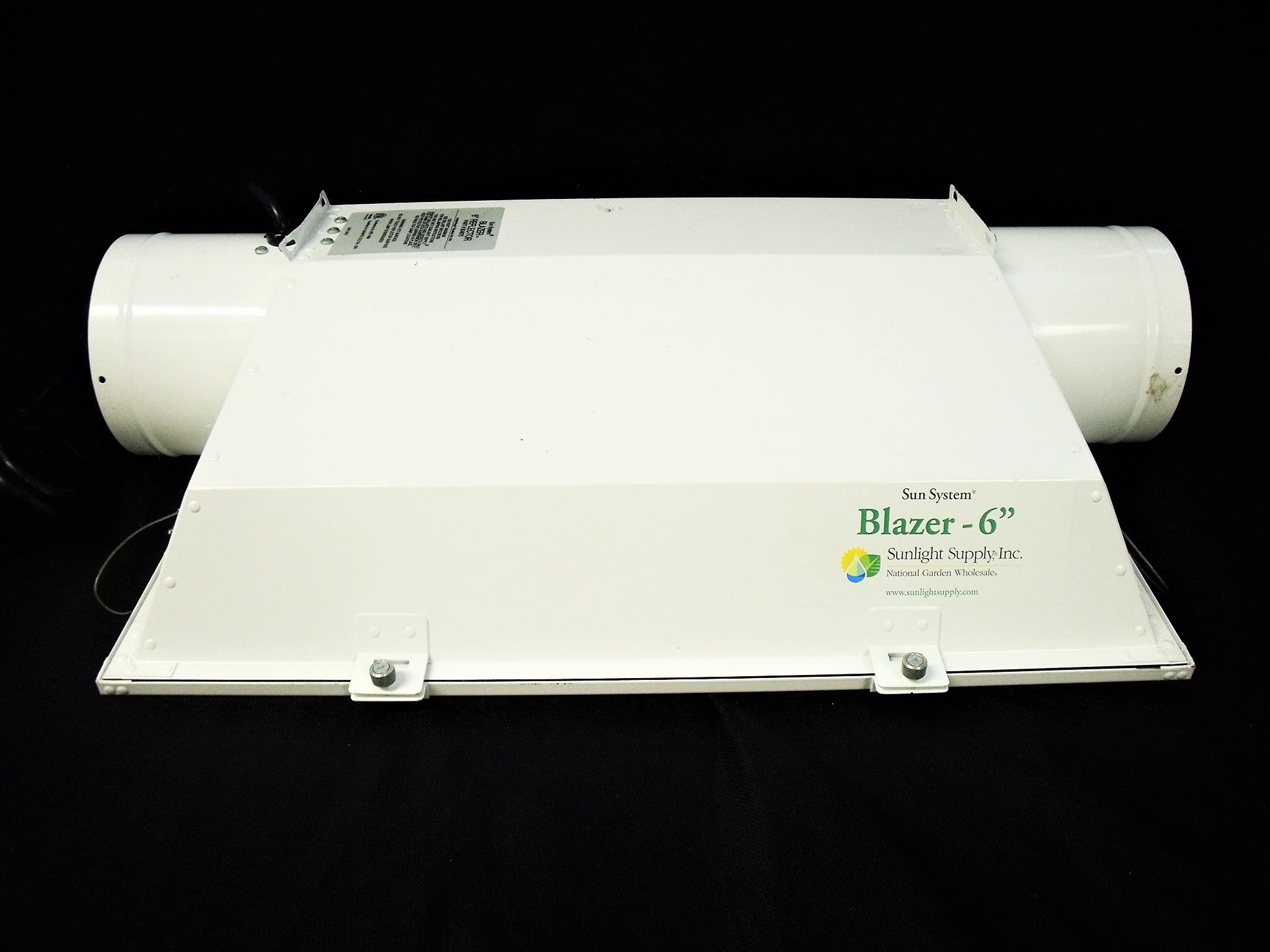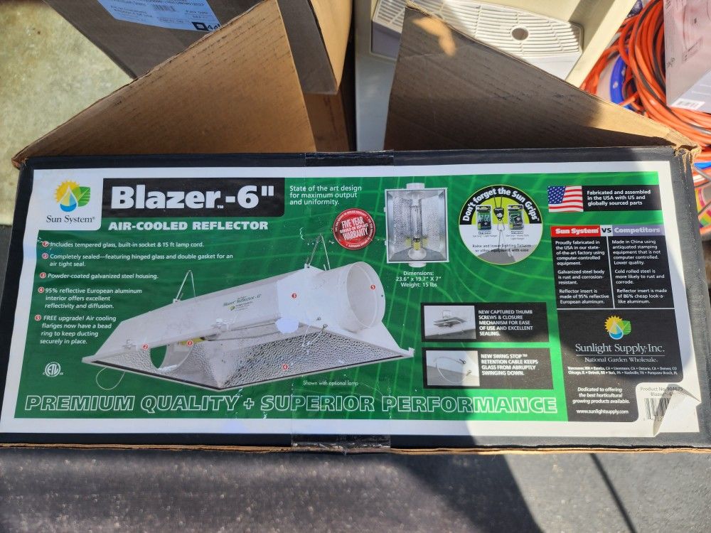 Sun System Blazer Air-Cooled Reflector The Sun System Blazer is a high-performance air-cooled grow light reflector designed for indoor gardens. It features a powder-coated galvanized steel housing, a 95% reflective German aluminum interior, and an airtight sealed design for efficient cooling and uniform light distribution. Available in 6″, 8″ models, the Blazer includes tempered glass, secure air-cooling flanges, a 15′ lamp cord, and mounting hardware. Built for durability, high heat management, and consistent PAR output.